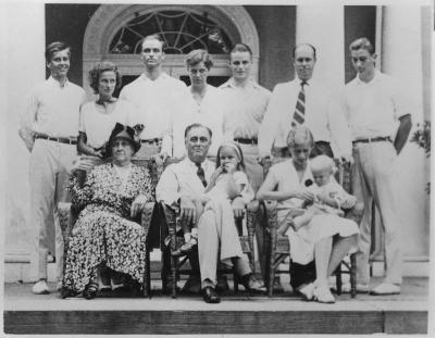 Franklin D. Roosevelt and family (left to right: Sara, FDR, Sistie, Anna, Buzzie. Back left to right: John, Betsy, James, Eleanor Roosevelt, Elliot, Curtis Dall, and Franklin Jr.) on the terrace in Hyde Park, New York. Photo Credit: Franklin D. Roosevelt Presidential Library & Museum