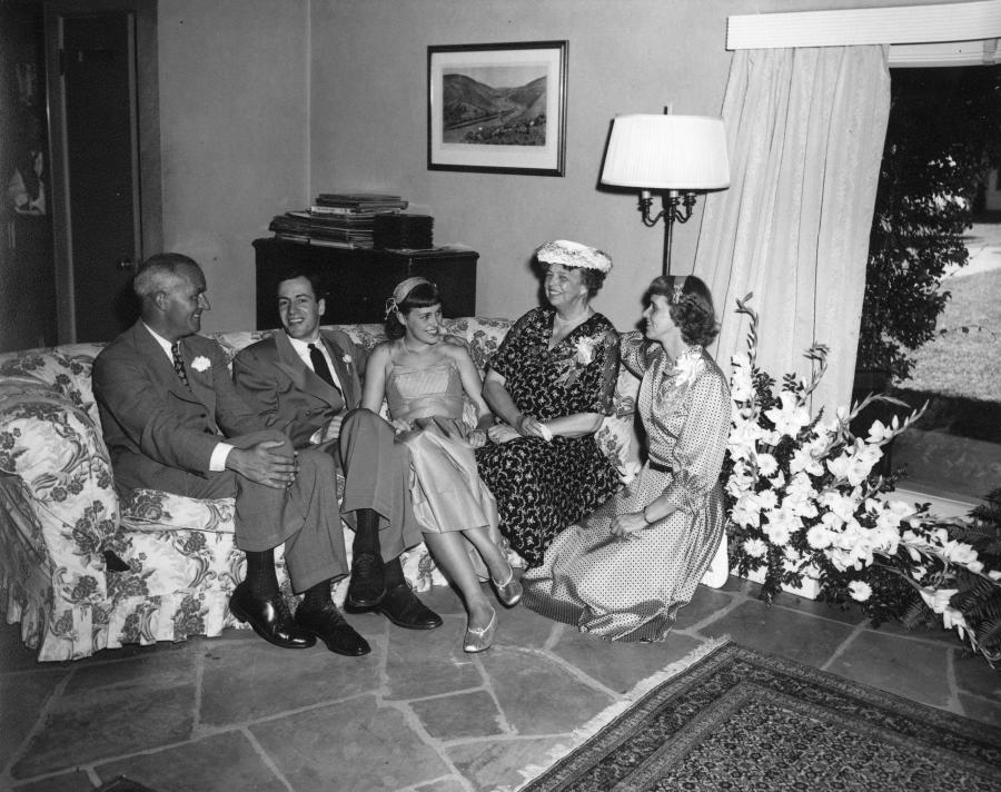 Eleanor Roosevelt attended the wedding of her oldest grandchild, Eleanor Dall Boettiger, to Van Seagraves on July 7, 1948. The wedding took place at the home of the bride's mother and step-father, Anna and John Boettiger, in Phoenix, Arizona. From left to right: John Boettiger, Van Seagraves, Eleanor Seagraves, Eleanor Roosevelt, and Anna Roosevelt Dall Boettiger. Photo Credit: FDR Presidential Library & Museum