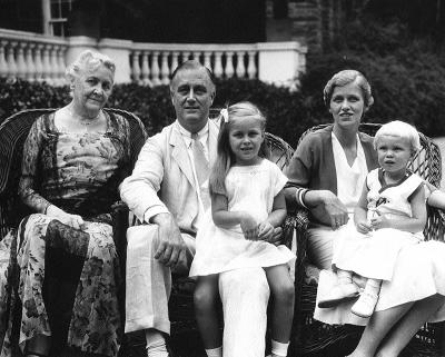 Franklin D. Roosevelt - seated in front of his home Springwood at Hyde Park, New York l-r: Sara, FDR with Sistie, Anna Roosevelt Halsted and Buzzie. Photo Credit: Franklin D. Roosevelt Presidential Library & Museum